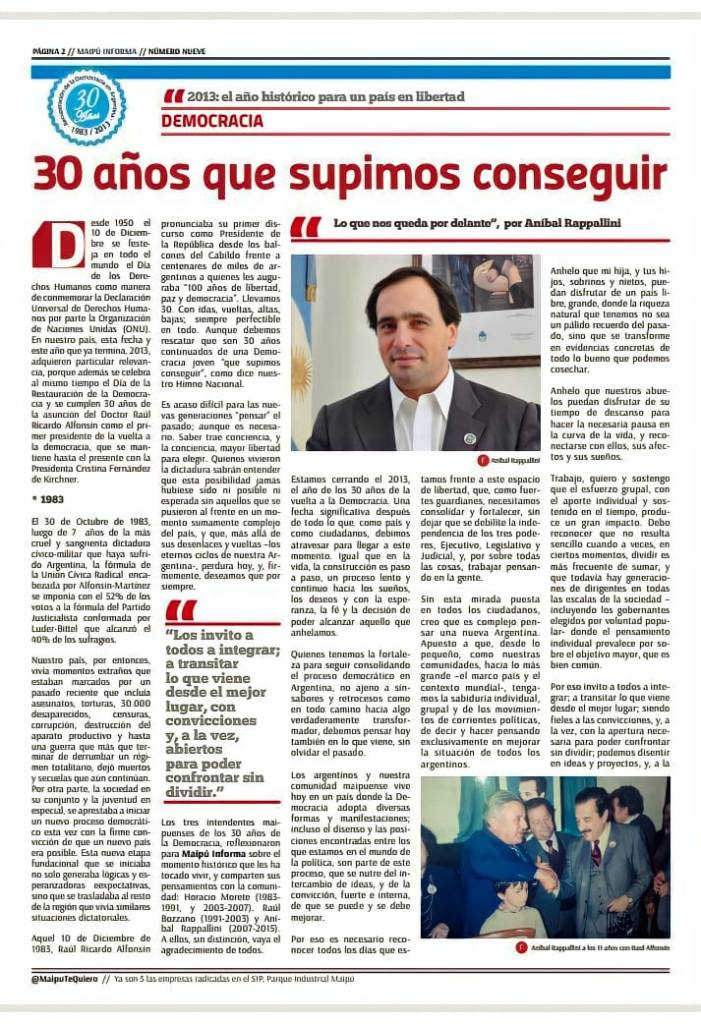 Queremos compartir con ustedes las reflexiones de tres de los intendentes locales democráticos que fueron publicadas en el Diario Maipú Informa editado por el Municipio de Maipú en el año 2013 cuando se cumplía el 30° aniversario de la vuelta a la democracia. Allí exponen sus pensamientos analíticos acerca de la importancia de vivir en democracia.